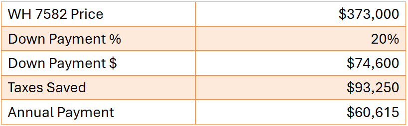 For example, if you buy a WH 7582 for $373k, you could save $93.3k in taxes by making the purchase in 2025. If you put $74,600 down to buy a QPP asset for $373,000, you could be saving $93,250 in taxes. If you can use your new equipment to increase your manure volume or gallons per minute, your efficiency improvements can cover the $60,615 in annual payments.